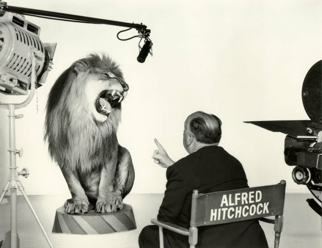 Alfred Hitchcock directing the MGM lion, circa 1958.