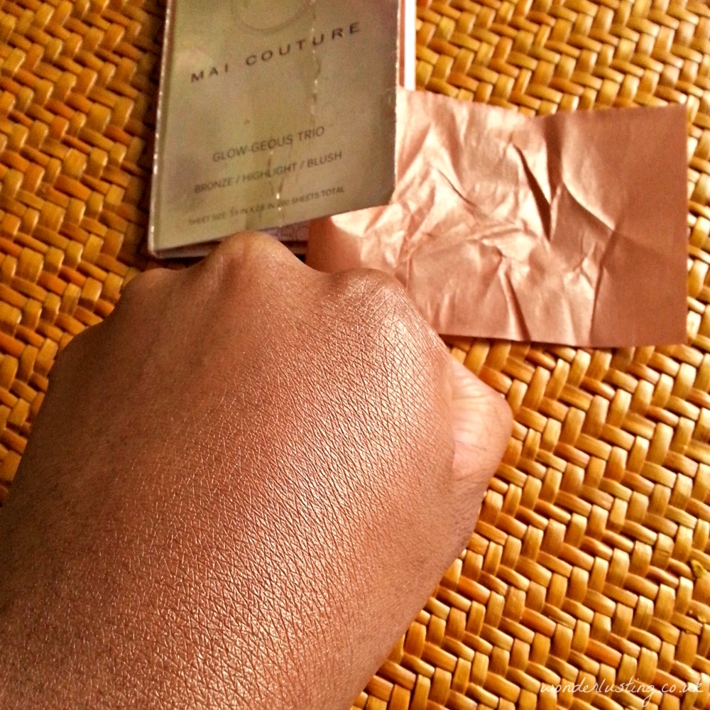 MAI COUTURE GLOW-GEOUS TRIO SWATCHED I got the Mai Couture Glow-geous booklet which contains 20 sheets each of Sin City bronzer, St Barts highlighter and Prettyful blusher.