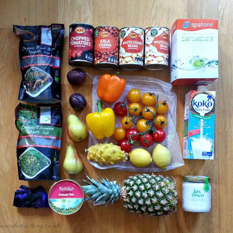 Made from parachute fabric, the bag feels very sturdy and there are plain as well as patterned versions to choose from. I found that it carries the equivalent of two supermarket plastic bags in terms of volume. Here’s a shop I did containing tins, cartons and a glass jarย which all comfortably fit in to the daily shopper. I would probably have used four supermarket bags doubling up for the heavy items.